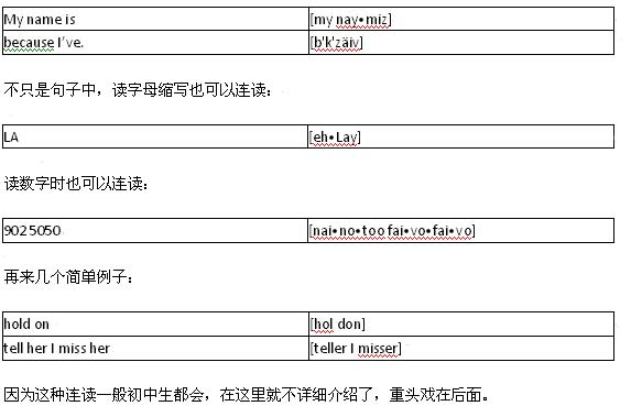 一般來說中國人比較熟悉這種連讀——前一個詞由輔音結(jié)尾,后一個詞由元音開頭,于是就很自然地連起來了,比如: