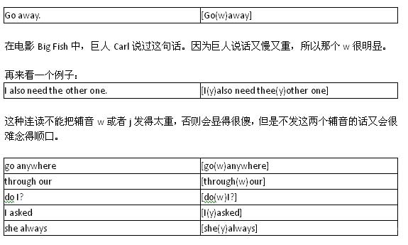 如果前一個詞是由元音[u]結(jié)尾,下一個詞由元音開頭,那么,在[u]后面加上一個輔音[w]