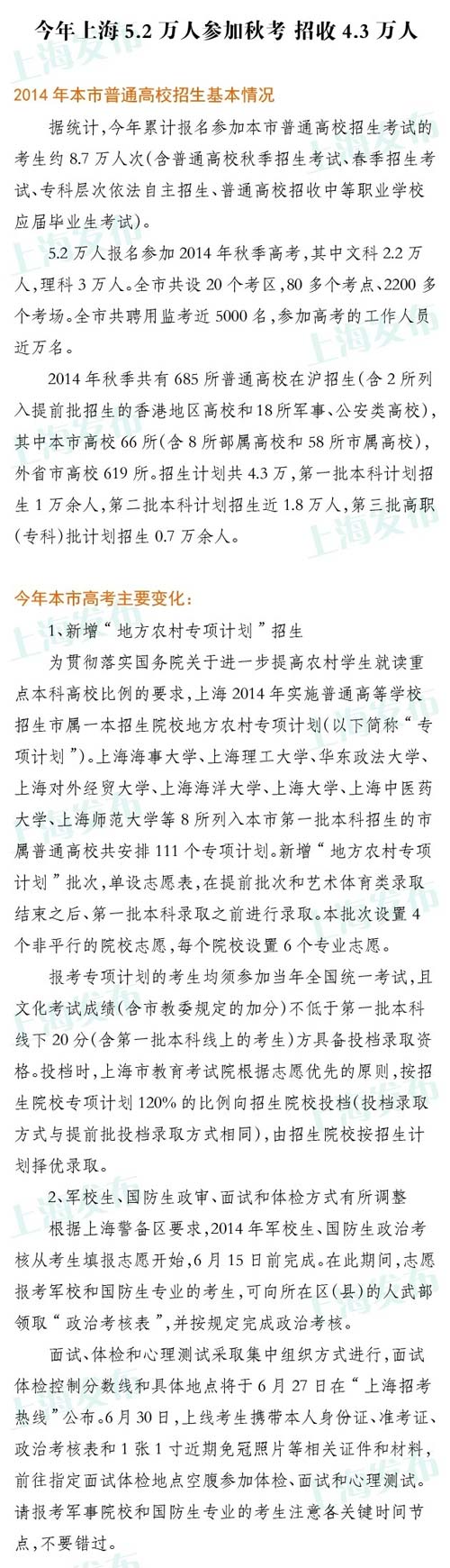 原標(biāo)題:2014上海高考報(bào)名人數(shù)5.2萬(wàn) 招生計(jì)劃4.3萬(wàn)