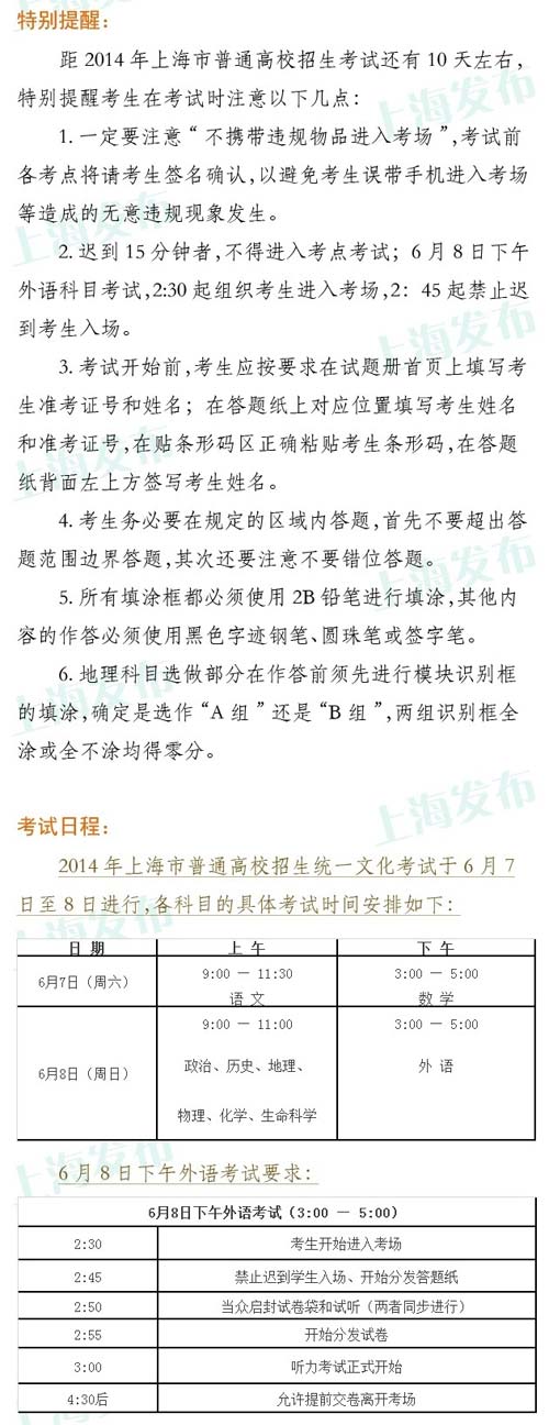上海高考倒計(jì)時(shí)只有10天了。據(jù)上海市政府新聞辦消息,5.2萬(wàn)人報(bào)名參加2014年秋季高考,招生計(jì)劃4.3萬(wàn),其中一本招1萬(wàn)余人,二本招近1.8萬(wàn)人。6月7日(周六)上午語(yǔ)文,下午數(shù)學(xué);6月8日(周日)上午政治、歷史、地理、物理、化學(xué)、生命科學(xué),下午外語(yǔ)。