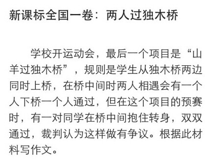 @Vista看天下:#高考作文吐槽#新課標(biāo)全國(guó)第一卷的山羊過(guò)獨(dú)木橋,倆人相遇抱住轉(zhuǎn)身,裁判認(rèn)為有爭(zhēng)議,多好的題目,為何有些同學(xué)關(guān)注點(diǎn)在抱住的是不是倆男生,喂,你們關(guān)注點(diǎn)也太奇怪了…