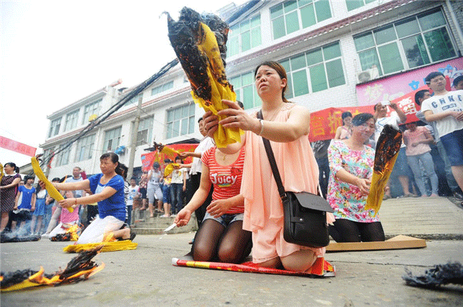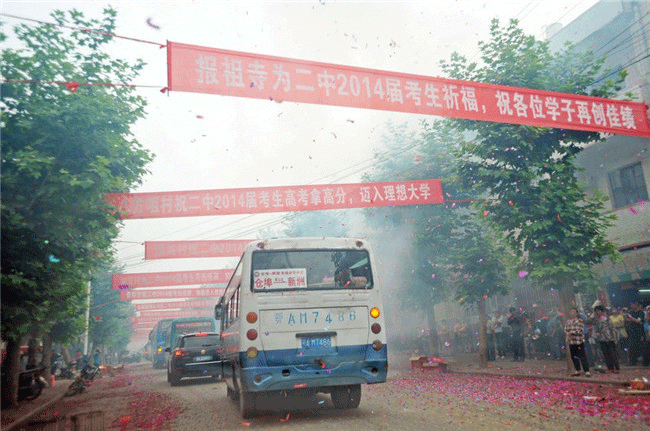 6月6日,武漢新洲二中門口,鞭炮、禮花、禮炮也于8時8分同時被點燃。上萬名居民自發(fā)聚集到校門口的路邊,為即將去邾城街參加高考的千余名考生送行。警車開道,66輛送考車依次駛出校門。此時,送考家長和村民燒紙跪拜,點燃鞭炮,鑼鼓喧天。2014年6月6日,武漢新洲二中門口,鞭炮、禮花、禮炮也于8時8分同時被點燃。上萬名居民自發(fā)聚集到校門口的路邊,為即將去邾城街參加高考的千余名考生送行。警車開道,66輛送考車依次駛出校門。此時,送考家長和村民燒紙跪拜,點燃鞭炮,鑼鼓喧天。