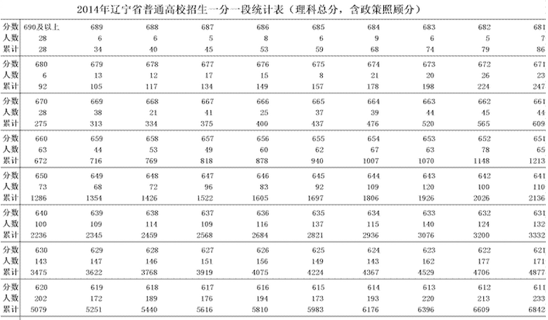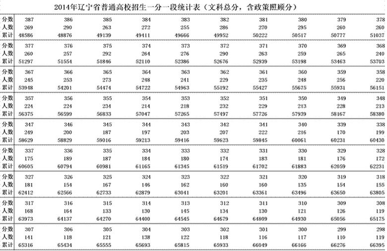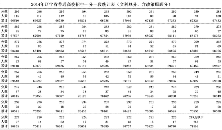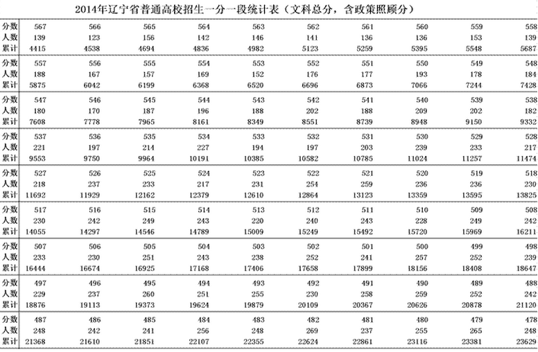2014遼寧省普通高校招生一分一段統(tǒng)計(jì)表(文科)