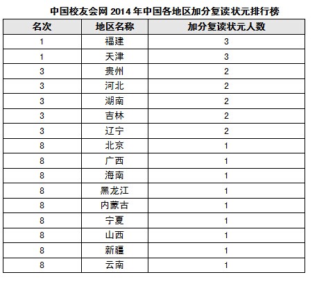 在中國校友會網(wǎng)調(diào)查到的2014年中國各地區(qū)高考新科狀元中,加分狀元有23人,復讀狀元有2人,“人造狀元”占狀元總數(shù)的32.05%。其中,福建和天津高考加分狀元人數(shù)最多,各有3人,并列中國校友會網(wǎng)2014年中國各地區(qū)加分復讀狀元排行榜榜首,其中今年天津高考狀元全為“加分狀元”。貴州、河北、湖南、吉林、遼寧等地區(qū)各有2人,并列第三;北京、廣西、海南、黑龍江、內(nèi)蒙古、寧夏、山西、新疆、云南等地區(qū)各有1人,并列第八。中國高考志愿填報咨詢專家、中國校友會網(wǎng)大學研究團隊專家、廈門大學博士馮用軍副教授指出,2014年是全國各地區(qū)高考加分“瘦身”政策實施第一年,但從各地加分狀元比例來看,高考加分瘦身運動效果并不明顯,實現(xiàn)教育公平和高考公平困難重重任重道遠。