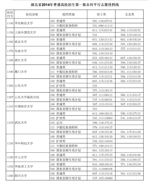2014年湖北省本科第一批錄取院校投檔線【2】