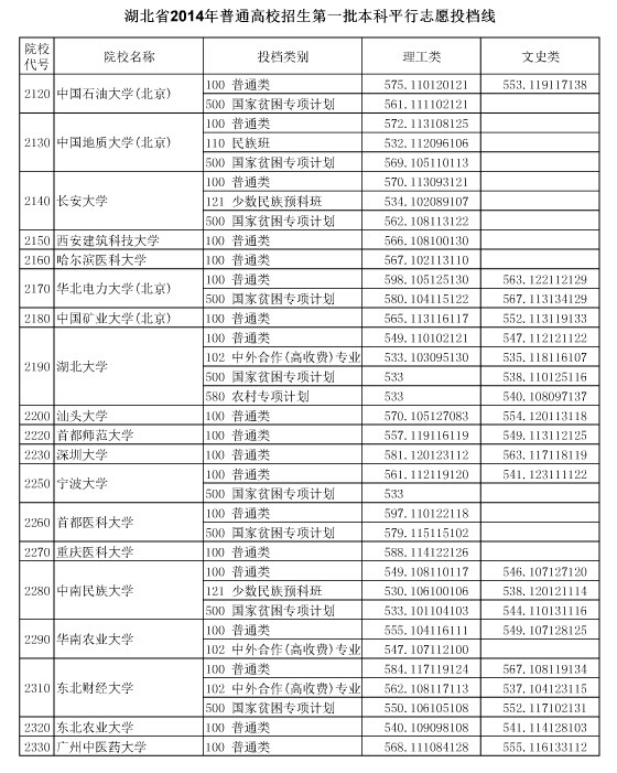 2014年湖北省本科第一批錄取院校投檔線【8】