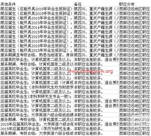 查看2015年國家公務(wù)員考試職位表發(fā)現(xiàn),此次西部邊遠地區(qū)的職位共有5240個,共招考8337人。國家公務(wù)員考試網(wǎng)還發(fā)現(xiàn),這些職位多面向應(yīng)屆畢業(yè)生招考,其中有少量職位僅需大專學(xué)歷。這些西部地區(qū)職位多集中中央行政機關(guān)省級以下職位和參照公務(wù)員管理的事業(yè)單位中,應(yīng)屆畢業(yè)生可抓住此次機會,到基層鍛煉,累計工作經(jīng)驗,豐富自己的閱歷,到基層建功立業(yè)。