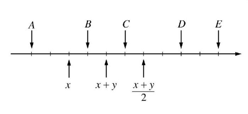 不少同學(xué)因?yàn)閤+y處于x和(x+y)/2之間而困惑不解,甚至認(rèn)為原題圖形有錯(cuò)。慣性思維促使同學(xué)們總覺(jué)得(x+y)/2應(yīng)該小于(x+y)呀,于是大家不知如何下手。其實(shí)(x+y)/2在哪里根本不影響本題,只要記住(x+y)/2一定在x點(diǎn)和y點(diǎn)之間,加上所有小豎線劃分的區(qū)間等值,就可以判定y點(diǎn)就是E。