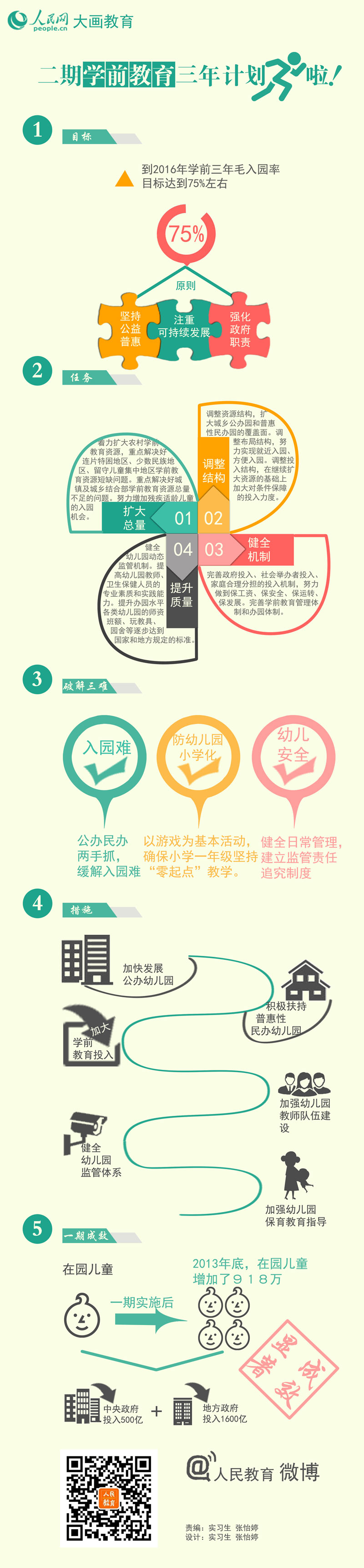 人民網(wǎng)北京11月20日電(實(shí)習(xí)生 張怡婷)近日,教育部、國(guó)家發(fā)展改革委、財(cái)政部印發(fā)了《關(guān)于實(shí)施第二期學(xué)前教育三年行動(dòng)計(jì)劃的意見(jiàn)》,引發(fā)了各界關(guān)注。二期三年學(xué)前教育行動(dòng)計(jì)劃的總體目標(biāo)和重點(diǎn)任務(wù)是什么?面對(duì)三難問(wèn)題該如何破解?一張圖讓你讀懂!