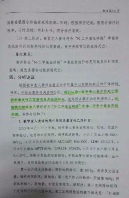 作為專業(yè)知識的人出庭的法醫(yī)胡志強提出四點分析意見:一分析認為,黃洋死亡原因是爆發(fā)性乙型病毒性肝炎;二關(guān)于N—二甲基亞硝胺的檢驗,根據(jù)目前檢測報告,認定黃洋中毒致死,缺乏依據(jù);三病理組織檢驗:肝衰竭可由多種病因引起,沒有絕對特異性。通過病理檢測,確定死亡性質(zhì)是中毒并且是特定二甲基亞硝胺中毒,是不客觀不科學的;四程序問題,上海市司法鑒定中心不具備國家資格,檢方鑒定程序等不合規(guī)定。