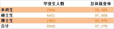 報(bào)告顯示,2014年,北京大學(xué)共有各類畢業(yè)生(含醫(yī)學(xué)部)8945人,截至2014年11月15日,該?傮w就業(yè)率為97.07%,其中本科生就業(yè)率95.96%、碩士生97.86%和博士生96.97%。