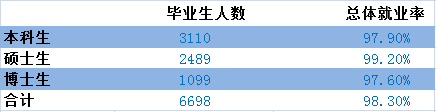 清華大學(xué)2014年則共有各類畢業(yè)生6698人,截至2014年12月1日,該?傮w就業(yè)率為98.3%,其中,本科、碩士和博士畢業(yè)生就業(yè)率分別為97.9%,99.2%和97.6%。