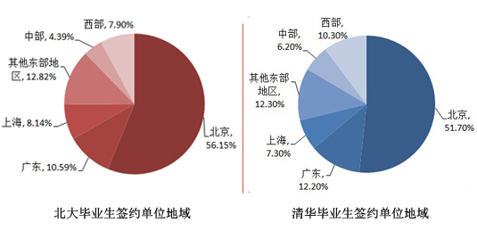 從國內(nèi)就業(yè)畢業(yè)生去向地區(qū)來看,兩校學(xué)子都愛留京,所占比例分別達(dá)到56.15%和51.70%,此外廣東和上海也對兩校學(xué)子有一定的吸引力,其他東部地區(qū)兩校差距不大,而去往中西部地區(qū)的畢業(yè)生中,清華高于北大。
