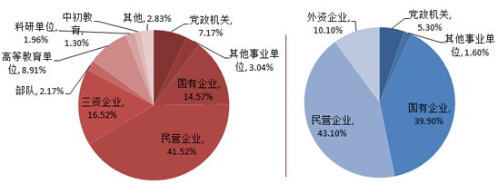 北大對去向單位性質(zhì)的分類做的比較詳細(xì),清華相對而言略粗曠,數(shù)字對比發(fā)現(xiàn),兩校學(xué)子去往最多的單位性質(zhì)是民營企業(yè),清華學(xué)子更愛國企,而北大去往教育科研機(jī)構(gòu)單位的比例比清華的高。