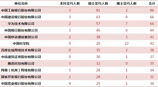 北大只列出了去向單位的前12名,前五位的分別是工商銀行、建設(shè)銀行、華為 、中國銀行 和中國移動(dòng),銀行占了三家。