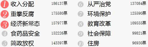 人民網(wǎng)北京2月26日電(記者 賀迎春)2015年全國兩會召開前夕,人民網(wǎng)就公眾關(guān)注的16個熱點(diǎn)問題展開網(wǎng)上調(diào)查,這已是人民網(wǎng)連續(xù)第14年推出兩會調(diào)查。截至2月25日16時,近一個月的調(diào)查吸引了約350萬人次參與,其中“教育改革”以近11萬票列關(guān)注度排行榜第八,名次與去年持平!笆杖敕峙洹薄ⅰ爸厝锤、“經(jīng)濟(jì)新常態(tài)”分列前三位。