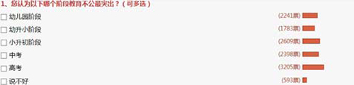 在“您認(rèn)為以下哪個階段教育不公最突出”調(diào)查中,24.98%的網(wǎng)民認(rèn)為是高考,20.33%的網(wǎng)民認(rèn)為是小升初階段,另分別有18.69%、17.46%、13.89%的網(wǎng)民選擇了中考、幼兒園階段、幼升小階段。