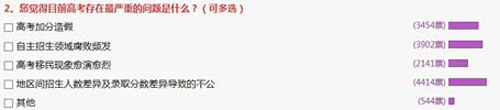 在“目前高考存在最嚴(yán)重的問題是什么”調(diào)查中,30.53%的網(wǎng)民選擇了“地區(qū)間招生人數(shù)差異及錄取分?jǐn)?shù)差異導(dǎo)致的不公”,比例最高。26.99%的網(wǎng)民選擇了“自主招生領(lǐng)域腐敗頻發(fā)”,23.89%的網(wǎng)民選擇“高考加分造假”,14.81%的網(wǎng)民選擇“高考移民現(xiàn)象愈演愈烈”。
