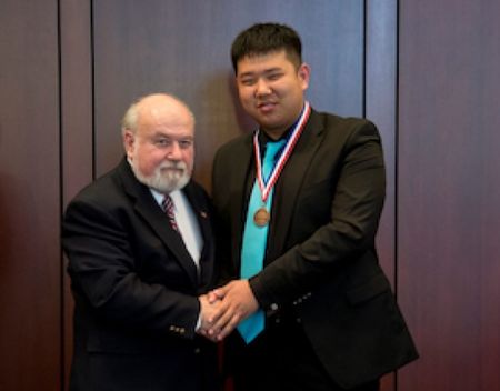 特洛伊高中華裔生包容(右)入選美國生物奧林匹克訓練營接受表彰。