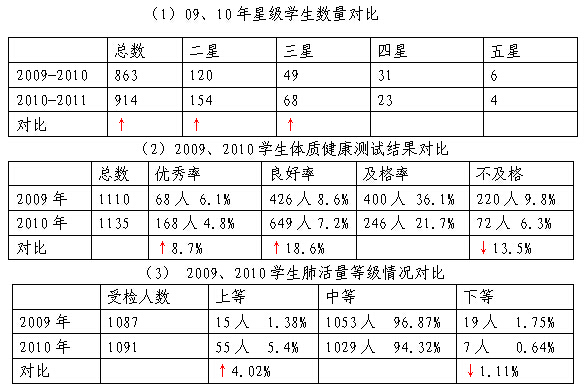 學校2009年起開始評選了“星級學生”。星級學生包括:體育之星、藝術之星、科技之星、學習之星、創(chuàng)作之星、體質健康之星。星期學生的評選讓我們的評價尺度更加多元,多一把尺子就多一批好孩子。三年來,學生參加各級各類比賽獲得國家級獎469項,市級獎336項,區(qū)級獎1074 項。體育活動見成效,學生身體素質明顯提高。