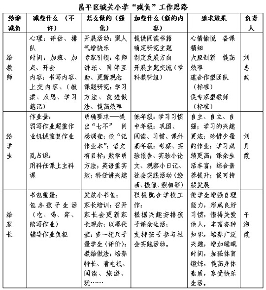 “減負”思路中明確提出了給誰“減負”?(學生、老師、家長);減掉那些負擔?應該怎樣去做?最后追求怎樣的效果?做到了目標內容明確,任務措施具體。