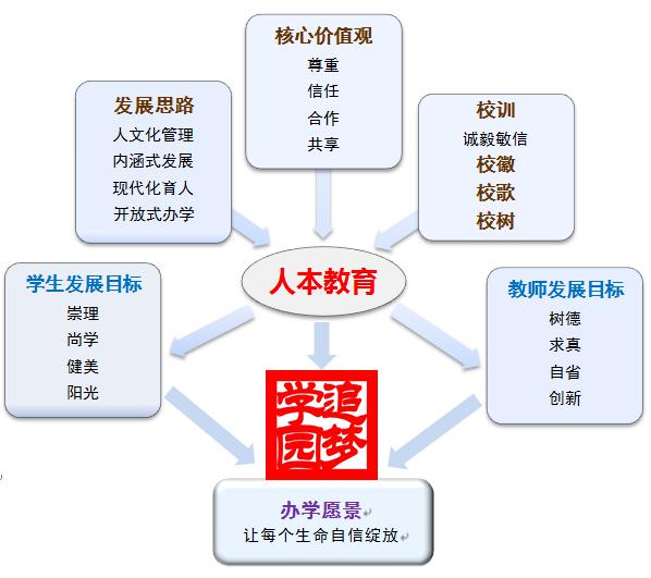 學(xué)校堅持理念引領(lǐng),確立了“讓每個生命自信綻放”的辦學(xué)愿景,確定以“人本教育”為核心,以師生的共同發(fā)展為本,激發(fā)每個人發(fā)展的潛力,讓每個學(xué)生樹立自信。弘揚“誠毅敏信”的校訓(xùn)精神和“尊重、信任、合作、共享”的核心價值觀,立德樹人,培育和踐行社會主義核心價值觀,堅持“人文化管理、內(nèi)涵式發(fā)展、現(xiàn)代化育人、開放式辦學(xué)”的發(fā)展思路,構(gòu)建生活化、多樣化、生態(tài)化的“學(xué)園課程體系”,打造樹德、求真、自省、創(chuàng)新的智慧教師,培養(yǎng)崇理、尚學(xué)、健美、陽光的幸福學(xué)生,把學(xué)校建設(shè)成為點燃夢想、實現(xiàn)夢想的追夢學(xué)園,讓學(xué)生敢于有夢、勇于追夢、勤于圓夢,讓每個生命在追夢學(xué)園里自信綻放。