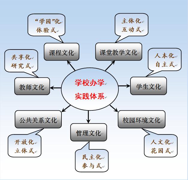 教育學(xué)和管理學(xué)都是人學(xué),教育就是以文化之。簡單理解,學(xué)校文化中的“文”就是辦學(xué)理念,“化”就是通過管理把辦學(xué)理念滲透在方方面面,用文化浸潤師生心靈。結(jié)合山區(qū)礦區(qū)寄宿制學(xué)校的實際情況和生源特點,學(xué)校堅持尊重個體差異,充分開展“人本教育”,以人為本,促進(jìn)教師專業(yè)化發(fā)展,激發(fā)學(xué)生的興趣和活力,開闊學(xué)生的思維和視野,點燃學(xué)生的夢想和激情,逐步形成了以促進(jìn)師生共同發(fā)展為目標(biāo)的“一化一式”的特色辦學(xué)實踐體系,包括“學(xué)園”化與體驗式的課程文化、主體化與互動式的課堂教學(xué)文化、共享化與研究式的教師文化、人本化與自主式的學(xué)生文化、開放化與立體式的公共關(guān)系文化、民主化與參與式的管理文化、人文化與花園式的校園環(huán)境文化等。