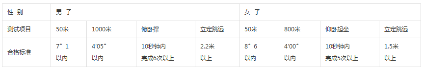 凡報考我院治安管理、交通管理、刑事技術(shù)、刑事執(zhí)行四個專業(yè)的考生,必須參加由省公安廳和學(xué)院統(tǒng)一組織的面試和體能測試,且成績合格。合格標(biāo)準(zhǔn)所稱以上、以內(nèi)均包括本數(shù)。具體見附表1: