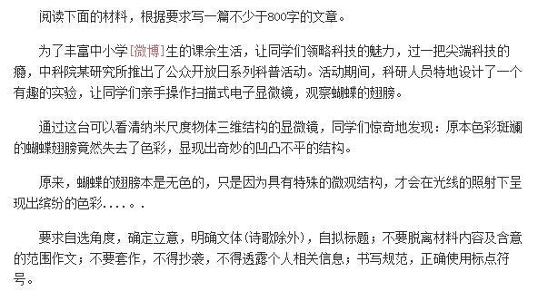 在今年3月23日的《中國(guó)科學(xué)報(bào)》刊登了一篇科普文章《蝴蝶翅膀的靈感》,科學(xué)家近日研制出一種以水為彩色墨水的重復(fù)書寫紙。而這一文章闡述創(chuàng)新原理的部分正是安徽高考作文的材料。