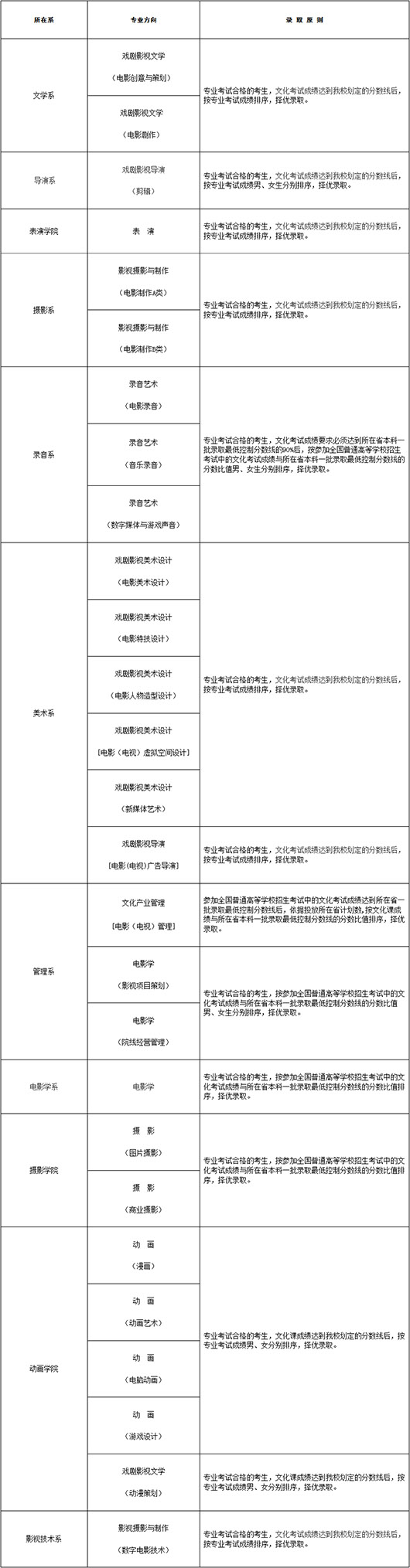 1.報(bào)考影視表演專業(yè):按我校投放所在省的招生計(jì)劃,以影視表演專業(yè)考試成績(jī)排序擇優(yōu)錄取。報(bào)考考生所在省未涉及影視表演專業(yè)統(tǒng)考的,必須參加我校影視表演專業(yè)?,同時(shí)取得專業(yè)考試合格證。