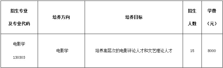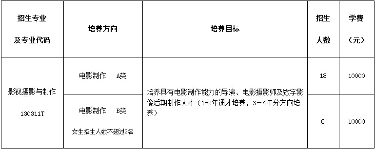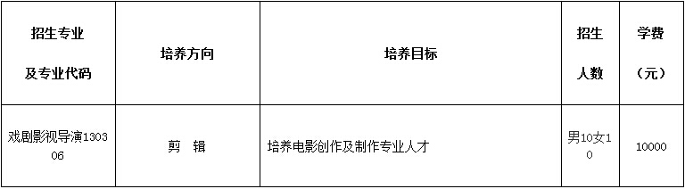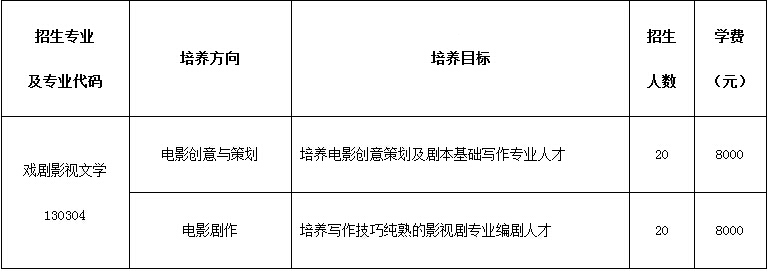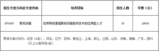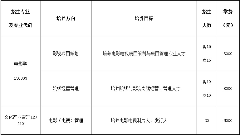 注:文化產(chǎn)業(yè)管理專業(yè)電影(電視)管理方向具體分省計(jì)劃為:北京(4名),河北、山西、遼寧、江西、湖北、廣東、重慶、四川(以上省市各2名)。該專業(yè)不設(shè)專業(yè)課程考試,請考生按分省計(jì)劃直接參加高考,按分省計(jì)劃及文化產(chǎn)業(yè)管理專業(yè)錄取原則擇優(yōu)錄取。