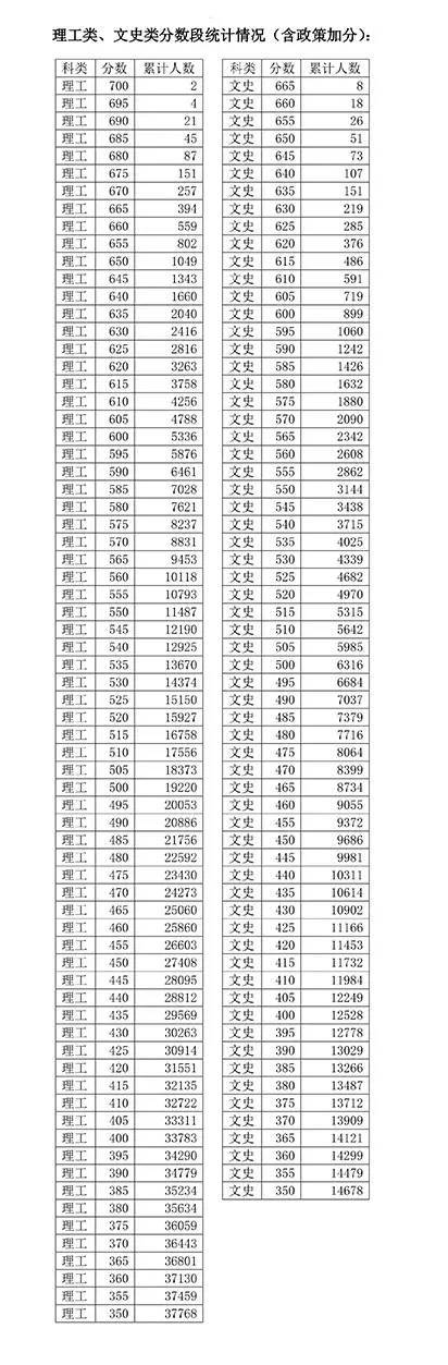 天津2015高考理工類(lèi)、文史類(lèi)分?jǐn)?shù)段統(tǒng)計(jì)情況(含政策加分)
