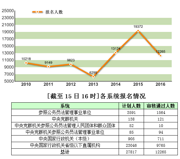 10月15日是2016國(guó)家公務(wù)員考試報(bào)名的第一天,據(jù)中公教育數(shù)據(jù)統(tǒng)計(jì),從早八點(diǎn)開(kāi)放報(bào)名到下午4點(diǎn),8小時(shí)內(nèi)報(bào)名系統(tǒng)通過(guò)審核12265人,雖不及去年同期近兩萬(wàn)人的數(shù)據(jù),但仍高于歷年來(lái)首日?qǐng)?bào)名人數(shù)的平均值。有3696個(gè)職位實(shí)現(xiàn)了“零的突破”,已有考生審核通過(guò),占總職位數(shù)的24%左右。