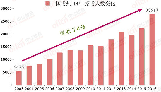 國(guó)家公務(wù)員考試招考人數(shù)從2003的5475人到2016年的27817人,增長(zhǎng)了4倍,超過(guò)了職位增長(zhǎng)數(shù)。2016國(guó)考的招錄人數(shù)也是歷年來(lái)最多的。