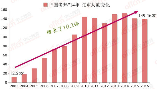 國(guó)家公務(wù)員考試報(bào)名過(guò)審人數(shù)從2003的12.5萬(wàn)到2016年的139.46萬(wàn),增長(zhǎng)了10.2倍,遠(yuǎn)遠(yuǎn)超過(guò)了招錄人數(shù)的增長(zhǎng)速度。從這14年總體來(lái)看,2014年是過(guò)審人數(shù)最多的一年,達(dá)到152萬(wàn)人,2013年稍遜2014年,達(dá)到150萬(wàn)人。另外,2010,2011,2015年過(guò)審人數(shù)也均超過(guò)了140萬(wàn)。近14年國(guó)考報(bào)名過(guò)審人數(shù)的激增令人咂舌,不僅是因?yàn)閲?guó)考擴(kuò)招的結(jié)果,也是公眾對(duì)“金飯碗”的熱愛(ài)的表現(xiàn)。