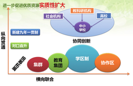 從橫向上看,各區(qū)縣通過(guò)學(xué)區(qū)制、集團(tuán)或集群辦學(xué)、合作辦學(xué)、政府購(gòu)買服務(wù)等多種模式,實(shí)現(xiàn)校際橫向聯(lián)合,擴(kuò)大、重組優(yōu)質(zhì)教育資源。