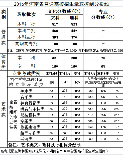 河南2016年高考控制分?jǐn)?shù)線:一本理523文517