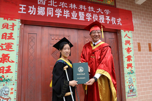 人民網(wǎng)北京6月27日電(熊旭 楊遠遠)昨天,在距離西安市400多公里的商洛市柞水縣杏坪鎮(zhèn)中山村,舉行了只有一名學生參加的特殊畢業(yè)典禮。身著學位服的西北農(nóng)林科技大學學位委員會主席孫其信校長,頂著炎炎夏日,驅車5小時,親手為因意外而殘疾的王功娜同學撥穗、頒發(fā)學位證書,并代表學校贈送一萬元慰問金。