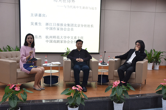 在杭州學(xué)軍中學(xué)60年校慶之際,詩人吳重生與杭州師范大學(xué)中文系主任黃岳杰,應(yīng)邀與中學(xué)生們一起,就“功夫在詩外”做了一次主題交流。