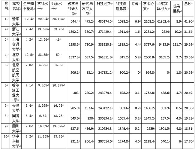 清華大學(xué)、浙江大學(xué)、上海交通大學(xué)、北京大學(xué)、北京航空航天大學(xué)、哈爾濱工業(yè)大學(xué)、天津大學(xué)、同濟(jì)大學(xué)、四川大學(xué)、華中科技大學(xué)位居全國高?蒲杏绊懥η笆,反映出工科院校、綜合類高?蒲袑嵙h(yuǎn)超文科類院校。