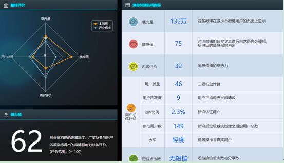 從整體分析結(jié)果來看,該條微博的曝光量達(dá)到132萬,情感值達(dá)到75,內(nèi)容評(píng)價(jià)達(dá)到32,用戶質(zhì)量值達(dá)到46,綜合微力值為62。綜合而言,該條微博傳播路徑和層級(jí)相對(duì)較少,傳播地域多集中于高校所在地,受眾活躍程度較低,微博情感值高,傳遞著正能量,具有一定的影響力。