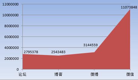2015-2016年度,全國126所高校網(wǎng)絡(luò)關(guān)注度總量達(dá)1955.7萬,其中論壇總量達(dá)279.5萬,博客總量254.3萬,微博總量314.5萬,微信總量1107.4萬。