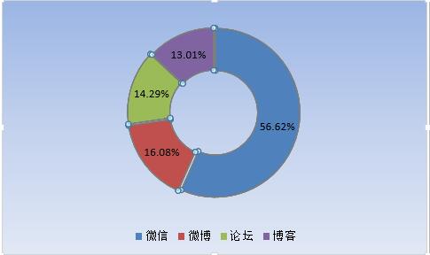 2015-2016年度,全國126所高校網(wǎng)絡(luò)輿論關(guān)注度總量中,微信關(guān)注度最高,占比56.62%;微博次之,占比16.08%;論壇、博客占比最低,分別為14.29%、13.01%。雙微平臺對于高校關(guān)注的總量占到全部份額的八成多,說明微博、微信等新興社交媒介在現(xiàn)階段影響力較大,論壇、博客等傳統(tǒng)社交平臺漸已式微。