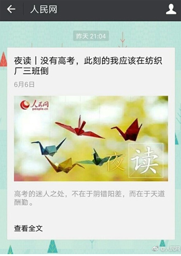 6日,人民網(wǎng)公號(hào)推送的文章:沒(méi)有高考,此刻的我應(yīng)該在紡織廠三班倒,也與全國(guó)卷III的作文題類(lèi)似。
