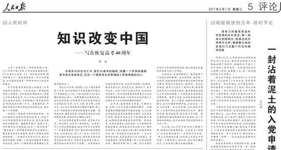 6月7日,人民日?qǐng)?bào)人民時(shí)評(píng)《知識(shí)改變中國(guó)——寫(xiě)在恢復(fù)高考40周年》,與全國(guó)卷III作文題緊密相關(guān)。