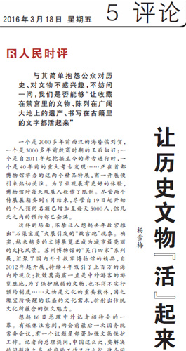 2016年3月18日,人民日?qǐng)?bào)發(fā)表的人民時(shí)評(píng)《讓歷史文物“活”起來(lái)》內(nèi)容,被選入今年北京卷的閱讀理解材料中。