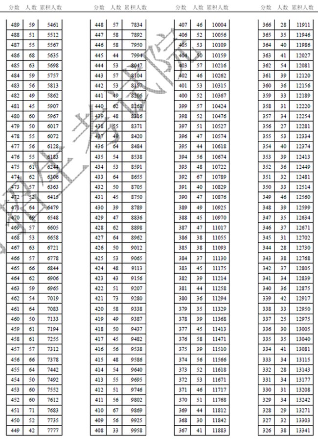 2017年天津高考文史類分?jǐn)?shù)段統(tǒng)計表