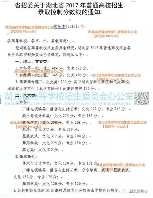 2017年湖北高考分?jǐn)?shù)線公布
