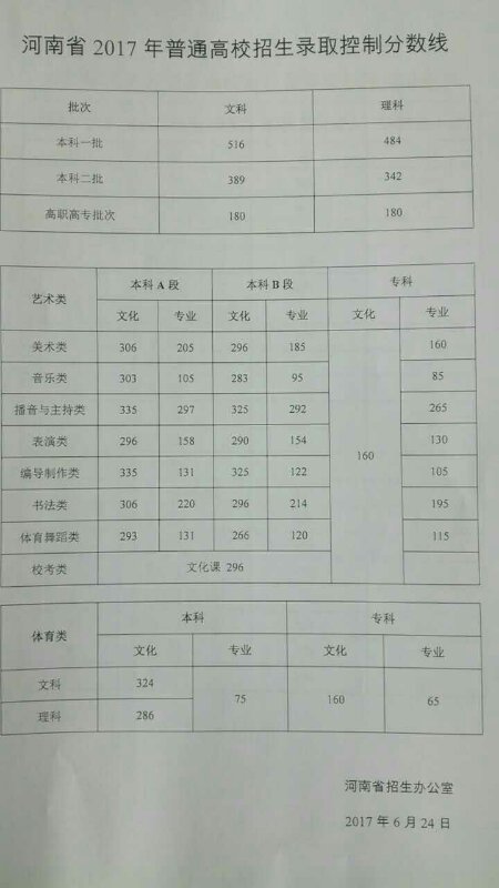 人民網(wǎng)鄭州6月24日電 (侯琳琳)6月24日下午,記者從河南省招生辦公室獲悉,河南省2017年普通高校招生錄取控制分?jǐn)?shù)線公布,本科一批錄取控制分?jǐn)?shù)線:文科516分,理科 484分;本科二批錄取控制分?jǐn)?shù)線:文科389分,理科342分。今年本科二批與三批合并錄取。?其浫】刂品?jǐn)?shù)線:文理科均為180分。