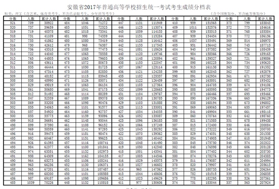 2017年安徽高考理科分?jǐn)?shù)段統(tǒng)計(jì)表
